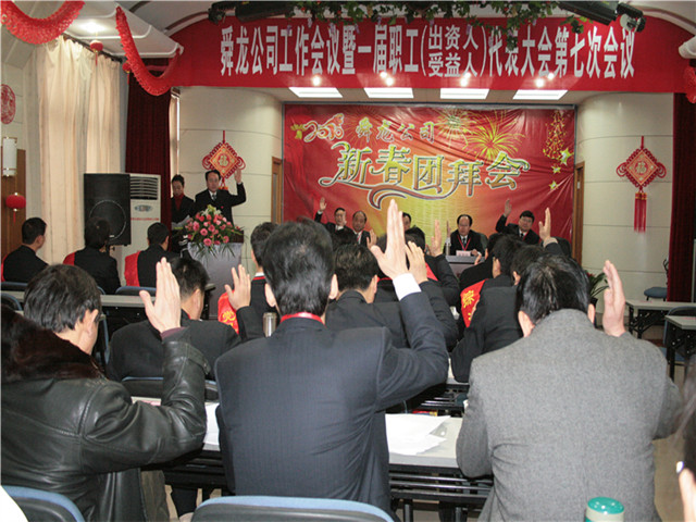 2011年元月28日上午8:00,舜龍公司工作會議暨一屆職工(出資人、受益人)代表大會第七次會議在公司會議室隆重召開。參加會議的人員有集團(tuán)公司股東代表劉萬春副部長、市場營銷部亓仲晨副部長、職工代表、受表彰的先進(jìn)集體和個人。