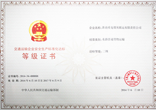 2014年5月,公司安全生產(chǎn)標準化建設(shè)工作,順利通過了交通部長江航務(wù)管理局委托安徽省航運商會考評機構(gòu)的達標考評;6月10日,長江航務(wù)管理局正式向公司頒發(fā)了交通運輸企業(yè)安全生產(chǎn)標準化二級達標證書,公司成為安徽省第一家一次性通過達標考評的水路普通貨物運輸企業(yè),是長航系統(tǒng)通過達標考評的第一家水路普通貨物運輸企業(yè)二級達標單位。