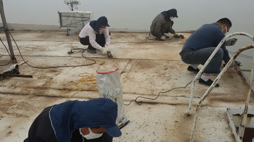 2014年11月4日~11日,在靖江焦化廠待卸期間,駕駛部陳學(xué)銀、張貴發(fā),輪機(jī)長(zhǎng)吳二強(qiáng)、許勇,在李飛經(jīng)理的帶領(lǐng)下,大家一起用磨光機(jī),對(duì)江輪天棚、駕駛臺(tái)、甲板等風(fēng)吹日曬雨淋容易生銹的部位進(jìn)行除銹打漆,維護(hù)保養(yǎng)。