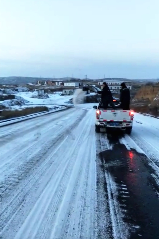 唐家會(huì)礦雪下得稍晚一些,6日下午,唐家會(huì)礦下起中雪,直接導(dǎo)致當(dāng)天發(fā)運(yùn)不到19時(shí)就早早結(jié)束。7日一早,唐家會(huì)礦物流分公司會(huì)同自有車隊(duì)人員全面組織開展融雪除冰工作,從分公司經(jīng)理到業(yè)務(wù)員全部出動(dòng),冒著寒風(fēng)對(duì)唐家會(huì)到托電40多公里的路段進(jìn)行撒鹽,一直到晚上近22時(shí)才全部結(jié)束,共撒鹽4噸多。大家整整一天的撒鹽又冷又累,但換來的成效非常明顯:8日一早,車輛陸續(xù)恢復(fù)發(fā)運(yùn),全天共發(fā)運(yùn)152車5569噸。