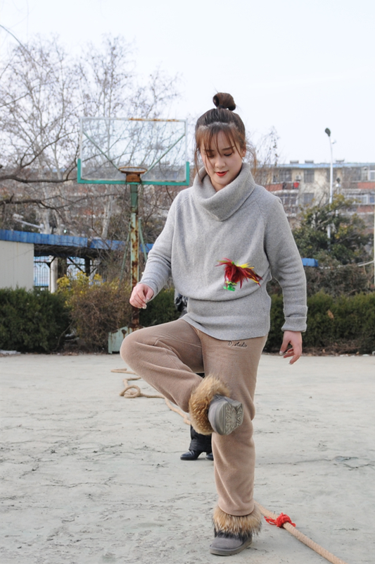 踢毽子比賽賽場上,選手們身手敏捷、精神抖擻,只見五彩的毽子高低起伏、上下翻飛。