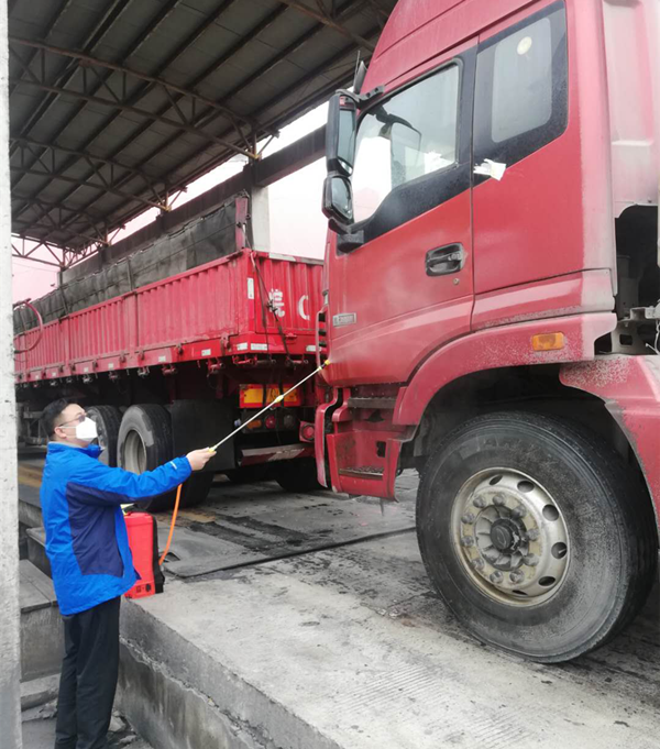 業(yè)務(wù)員彭昆監(jiān)督工作人員對進(jìn)礦煤車消毒