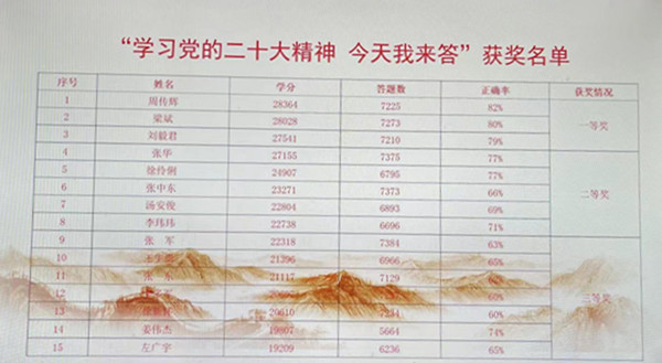 此次活動(dòng)公司黨委高度重視,對(duì)活動(dòng)參與方式、獎(jiǎng)勵(lì)等精心安排部署,并專門下發(fā)了《關(guān)于“學(xué)習(xí)黨的二十大精神 今天我來(lái)答”有獎(jiǎng)競(jìng)答活動(dòng)的通知》。公司黨委要求各級(jí)領(lǐng)導(dǎo)干部帶頭參與,全體黨員積極響應(yīng),在崗黨員參與率達(dá)到了100%,學(xué)分在20000分以上的達(dá)到了13人。經(jīng)過(guò)100天的學(xué)習(xí)競(jìng)答,評(píng)選出一等獎(jiǎng)3人,二等獎(jiǎng)5人,三等獎(jiǎng)7人。