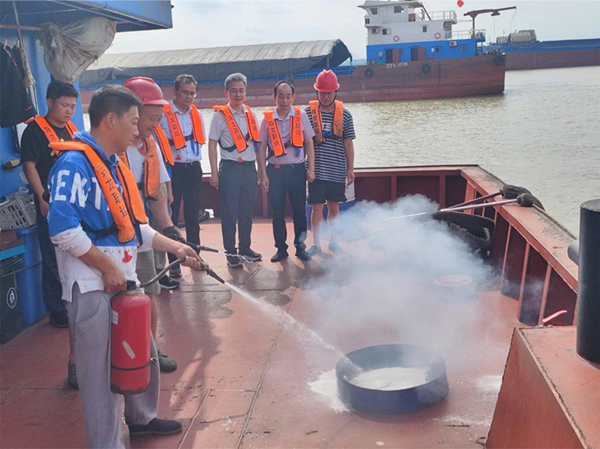 在甲板上,安監(jiān)辦主任鄒建春組織全體船員開展了滅火器規(guī)范使用、對(duì)人員落水應(yīng)急處置等項(xiàng)目的演練,通過演練增強(qiáng)船員安全意識(shí),提升船員應(yīng)急處置能力,真正實(shí)現(xiàn)人人講安全,個(gè)個(gè)會(huì)應(yīng)急。