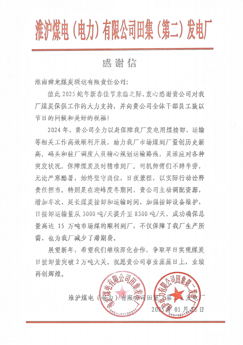 新年伊始,淮滬煤電(電力)有限公司田集(第二)發(fā)電廠發(fā)來(lái)感謝信,對(duì)淮南舜龍煤炭聯(lián)運(yùn)有限責(zé)任公司2024年的辛勤付出和支持幫助表示感謝!